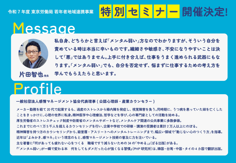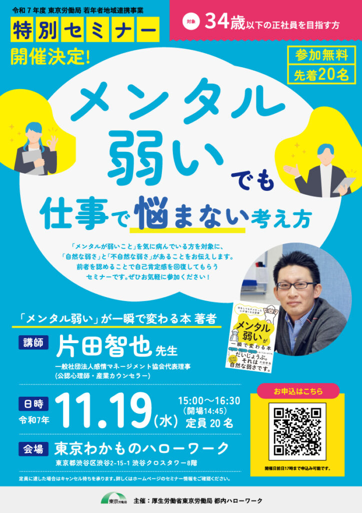 そんな悩みを抱える若者に向けて、令和7年11月19日(水)に特別セミナー「『メンタル弱い』でも仕事で悩まない考え方」を開催します。