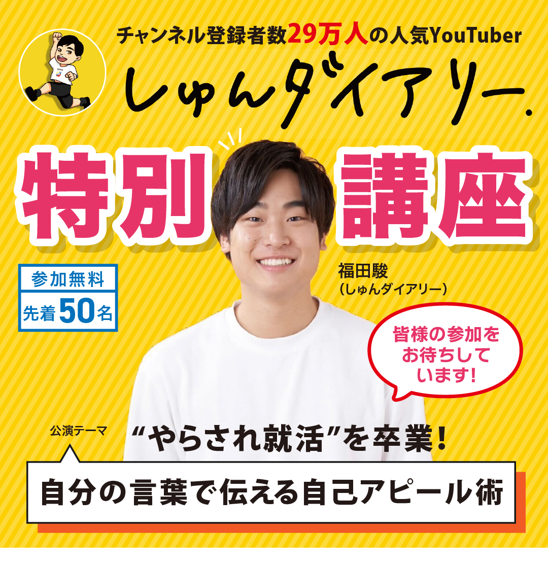 自分の言葉で伝える 自己アピール術就活YouTuber【しゅんダイアリー】福田氏が、東京新卒応援ハローワークに登場! 「どう話せば伝わる?」「自分の強みがわからない…」そんなあなたに、共感される自己PRの極意を伝授します!
