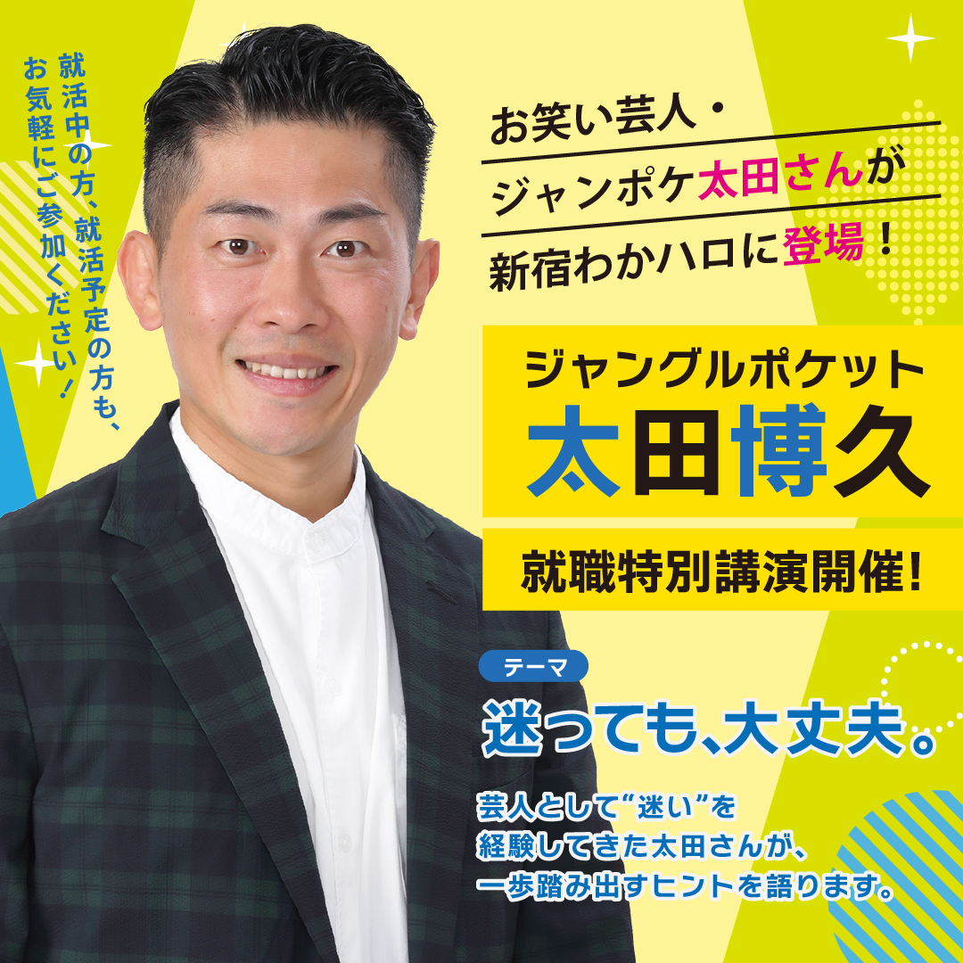 柔道一筋、就職内定も教員への道も捨てて芸人へ。迷いながら自分と向き合い続けた太田さんが、就活中の皆さんに不安や迷いの乗り越え方と次の一歩を踏み出すヒントを語ります。(※会場はチラシご覧ください)